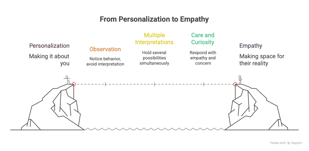 Each time you notice “I’m personalizing,” you’ve created a tiny bit of space between the automatic pattern and your response. Each time you ask “What am I observing versus interpreting?” you’ve practiced the skill. Each time you respond with “What’s going on?” instead of “What did I do?” you’ve modeled something different.