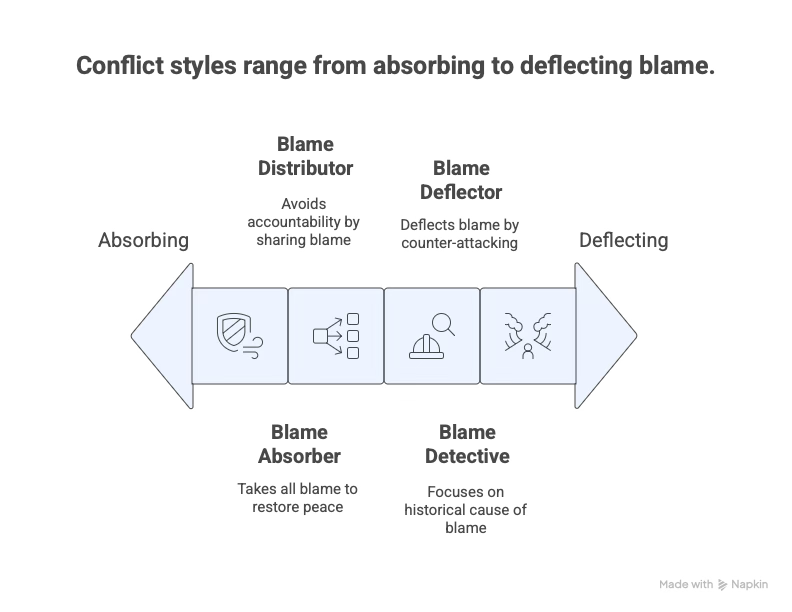 Our approach to blame is often tied to how we learned to handle conflict. Some people use blame as a way to calm things down ("It's all my fault, let's not fight"). Others use it as a weapon to win ("This is all your fault, so I don't have to change").