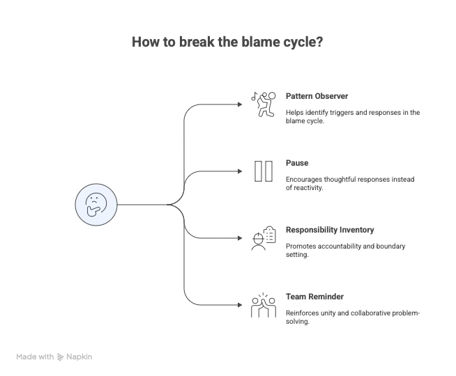 Practice the pause. The next time blame starts flying (toward you or from you), take a 30-second pause before responding. Ask yourself: "What would be most helpful right now?"
